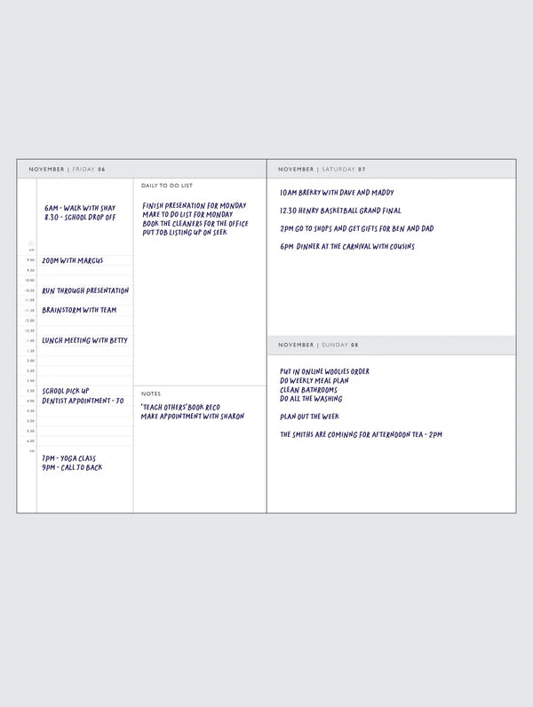 Weekends share the spotlight with half a page each, open, flexible, and ready for anything from brunch plans to binge-watching marathons.