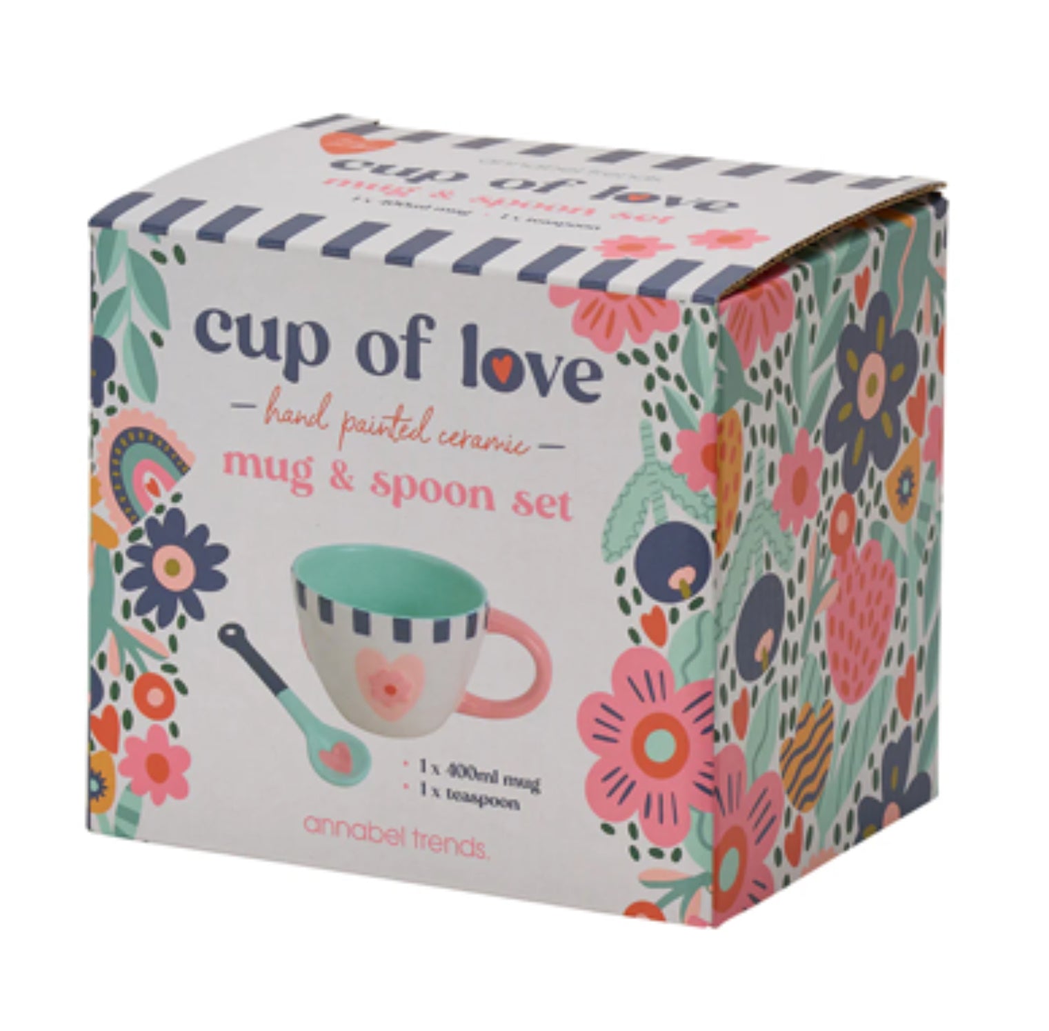 Delight that special someone with this charming Cup of Love mug & Spoon set! Featuring a gorgeous hand painted embossed heart and flower detail, the generous 400ml mug is perfect for those who like their cup full and their tea or coffee strong. Then make sure to stir in some sugar with the matching heart embossed ceramic teaspoon. This 2-piece set is just too sweet! Hand painted. 1 x 400ml Ceramic mug, 1 x Ceramic teaspoon. Box Size:17cm x 12cm x 15cm
