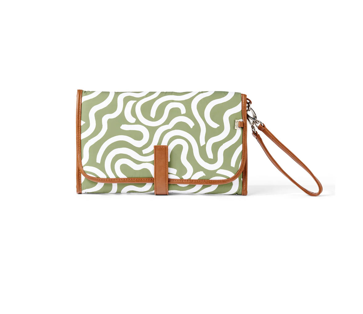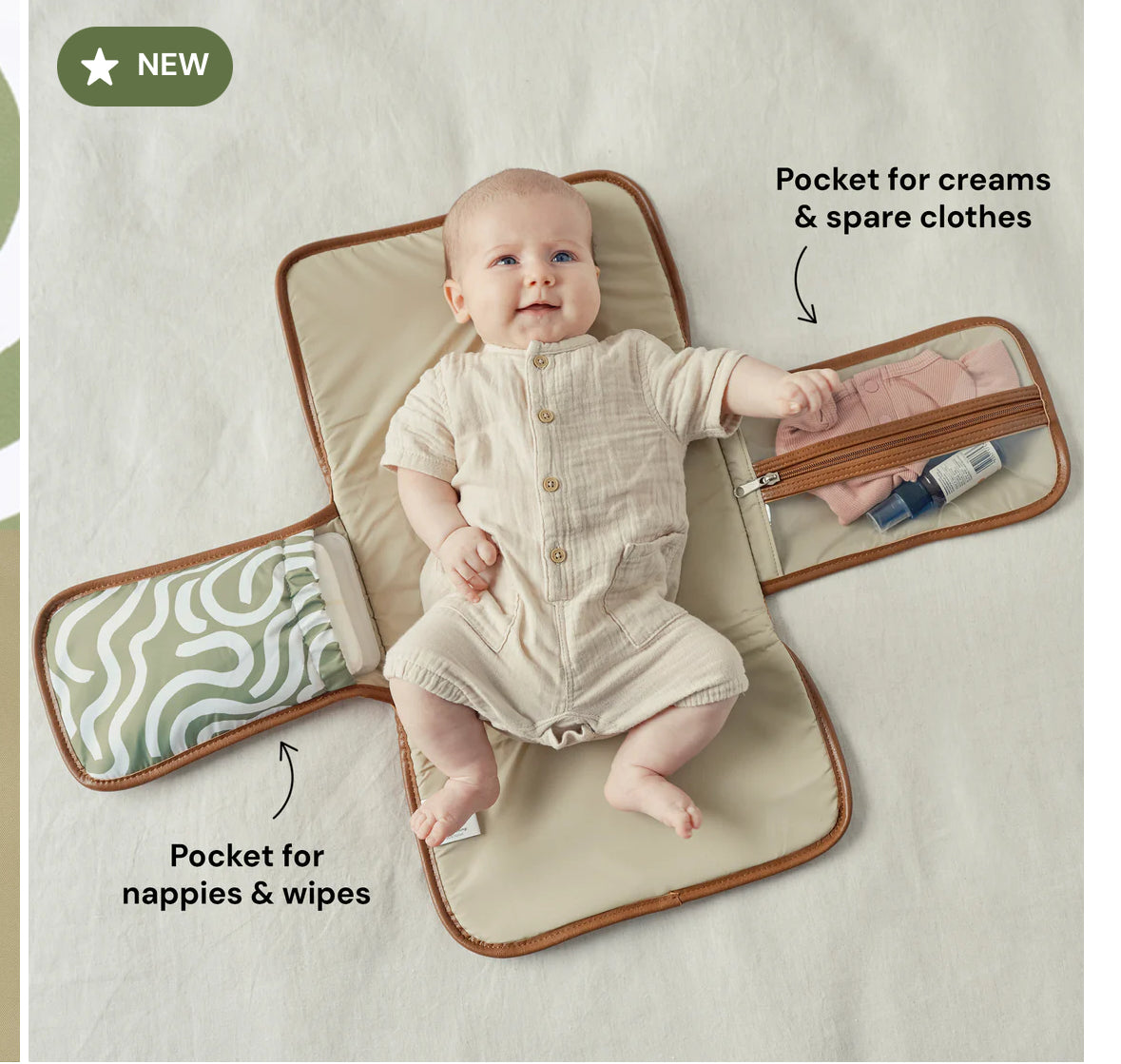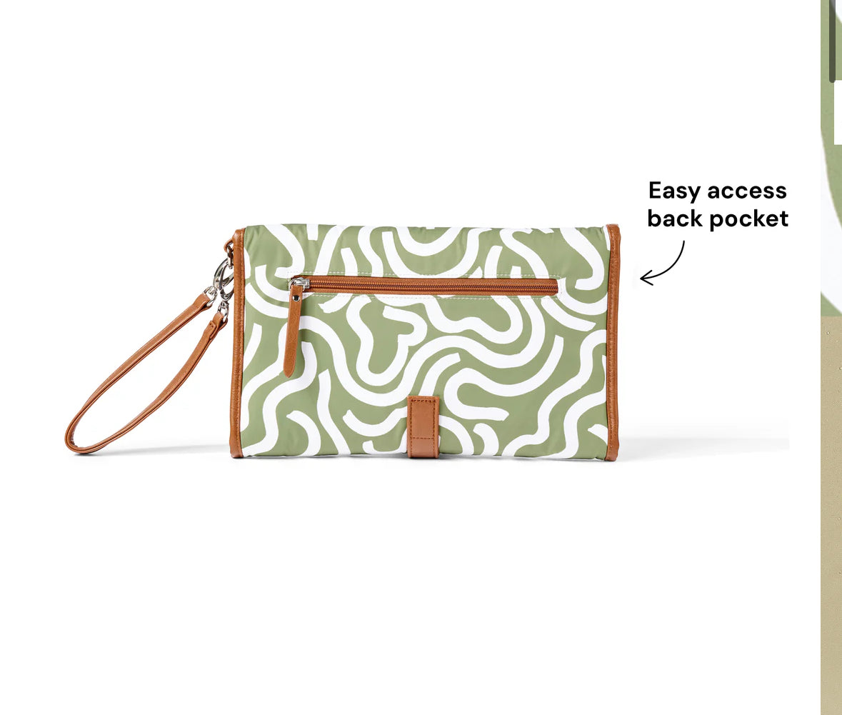 Our best-selling clutch folds out to reveal a padded mat to change baby's nappy on the go, a storage pocket for your nappies and a zip compartment for wipes & creams.
