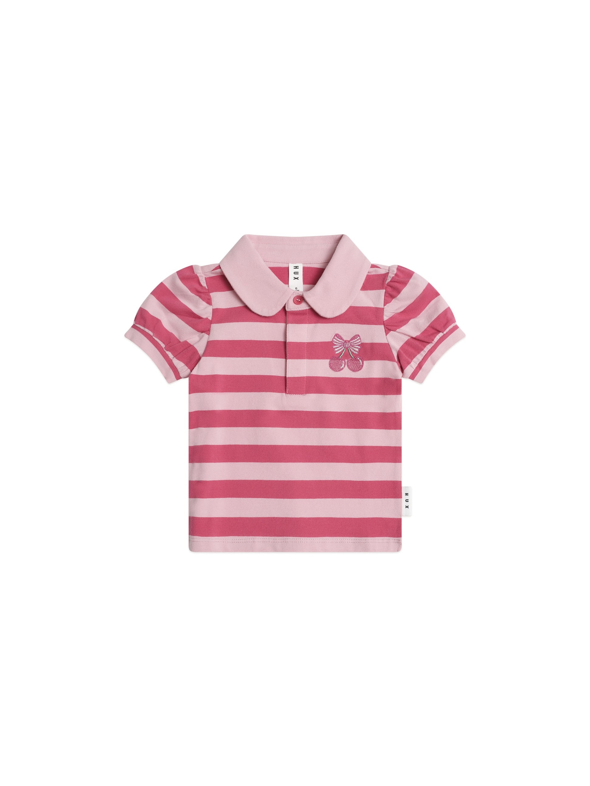 The puffy sleeve polo t-shirt you won't know how you lived without. Made from buttery soft organic cotton, it features a sparkly cherry pie chest embroidery, puff sleeves and peter pan collar.