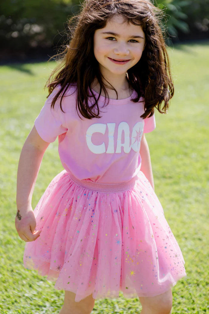 Introducing the Ciao Tee, the perfect addition to your child's wardrobe for those moments when a little extra fun is needed! This tee showcases a playful "Ciao" puff print at the center front, set against a stylish pink dip-dye printed effect. Crafted with both practicality and comfort in mind, it's designed to ensure your little one feels great all day long.
