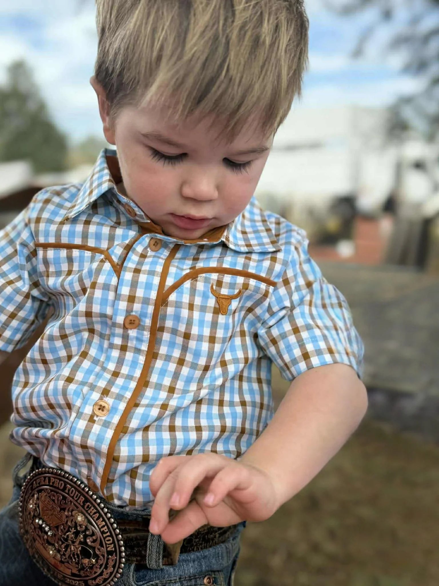 Any little country baby must have. Simply stunning, unique and keepsake gift idea. Our shirts are unique with their contrasting placket button down, piped yoke and inside collar trim. Standout colours, prints and 100% cotton. A design that has been made for tough wear, comfort and style.