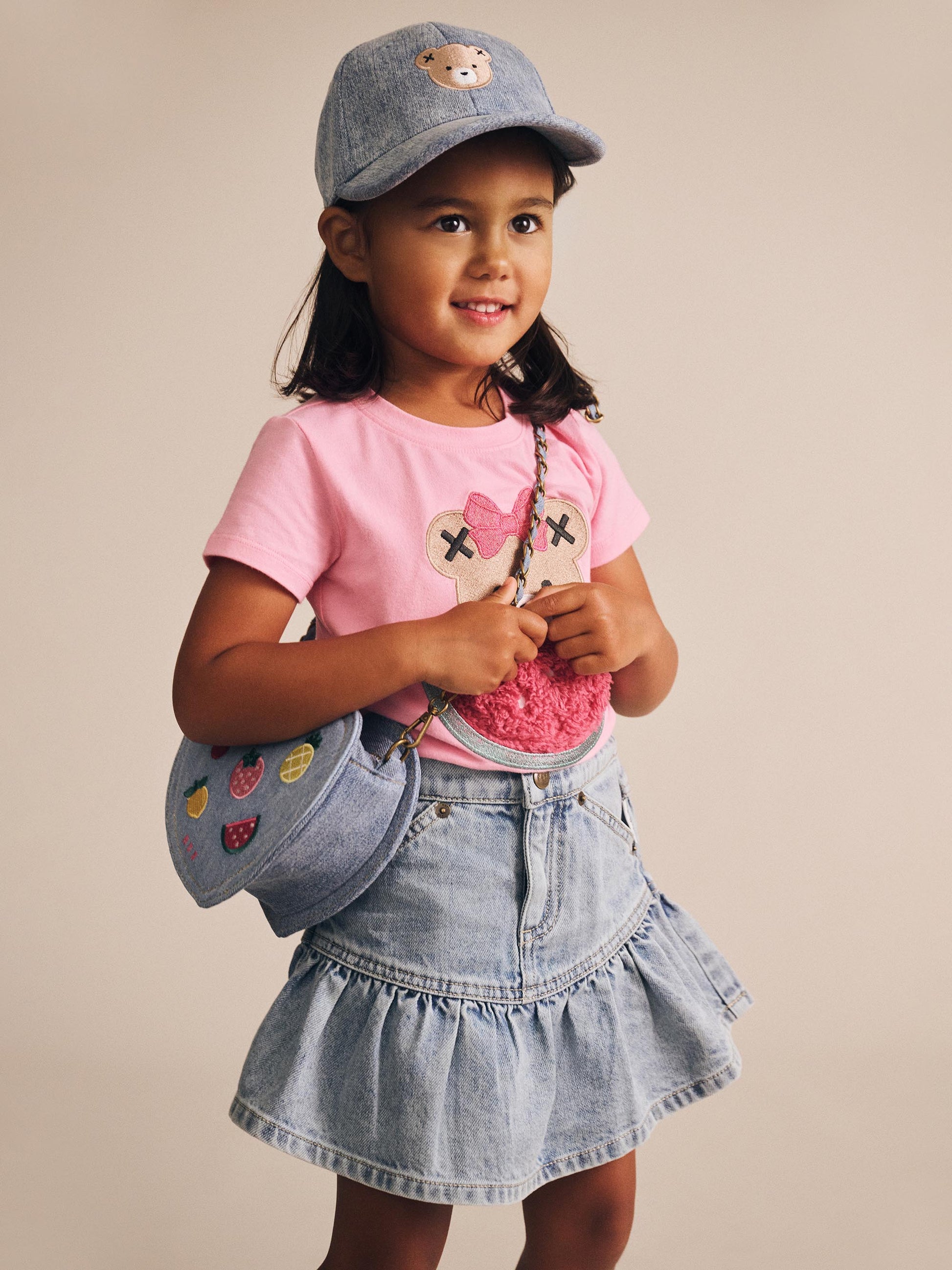 The kind of skirt they'll want to wear again and again. This 90s style mini is made from deliciously dreamy denim in in quintessential blue. It features a stretchy waistband, side and back pockets and a pretty frill flare hem.