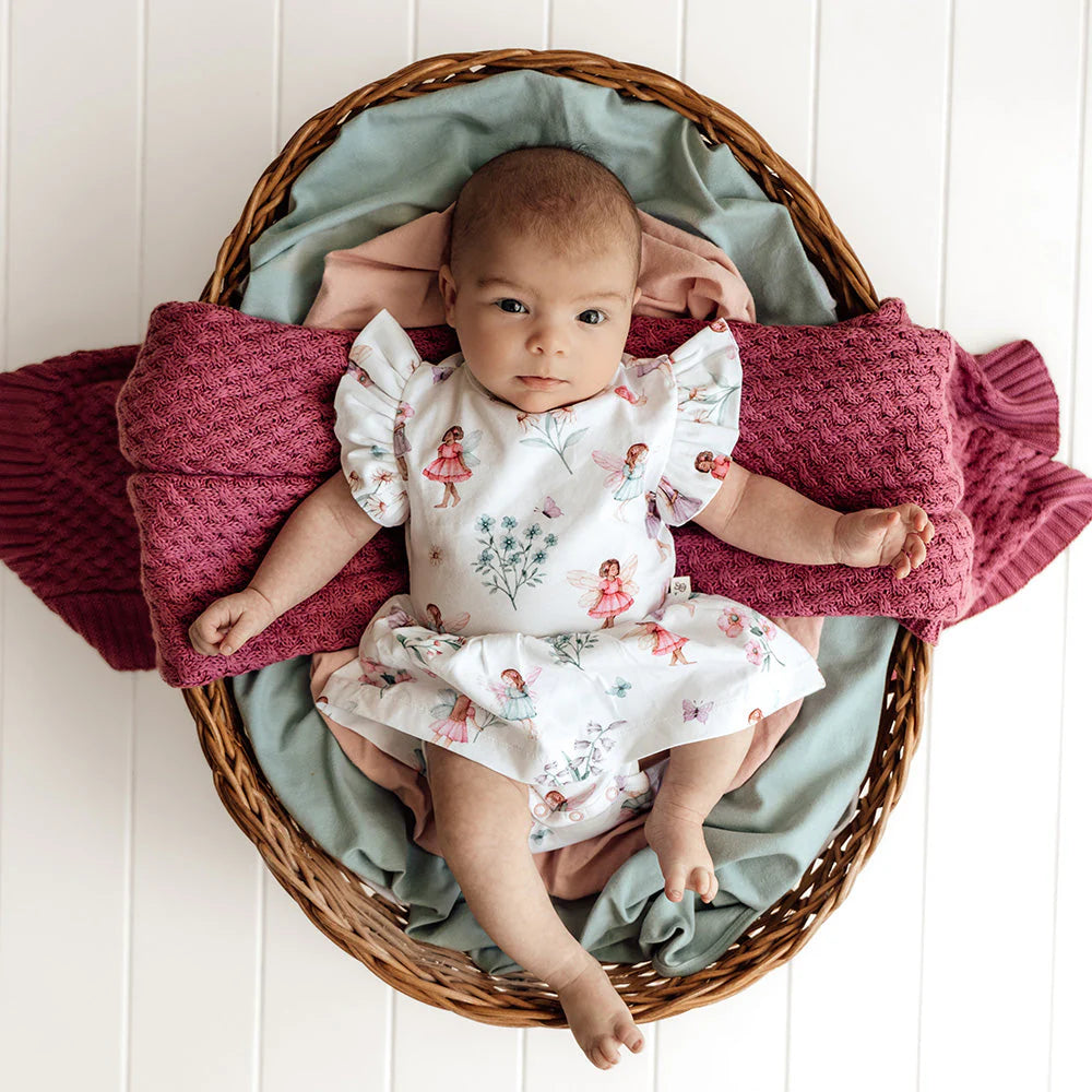Soft and stretchy, our dresses are easy-care and very comfy for bub. The sizes up to and including size 1 come with a snap underbody to go over a nappy. Size 2 and up doesn't have the snap body feature. We have really focused on the details and ensured the dresses up to size 1 are short enough so that a baby can crawl and not trip over the skirt. Size 2 and over, when they're walking, is a bit longer.