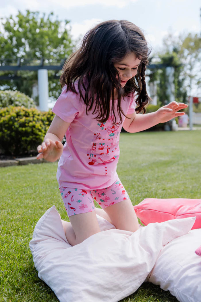 Milky Clothing Fairy Floss PJs. Made from super soft cotton elastane that's hard-wearing they will retain their shape wash after wash. These PJs are a bike short style and cap sleeve tee combo on a pink base. With a centre front festive Christmas print they will become a favorite for bedtime. Deck out the whole family in matching Christmas sleepwear! Choose from our adorable Christmas Zip Romper for babies, cozy two-piece Christmas pajamas for kids, and elegant Christmas nighties for little girls.