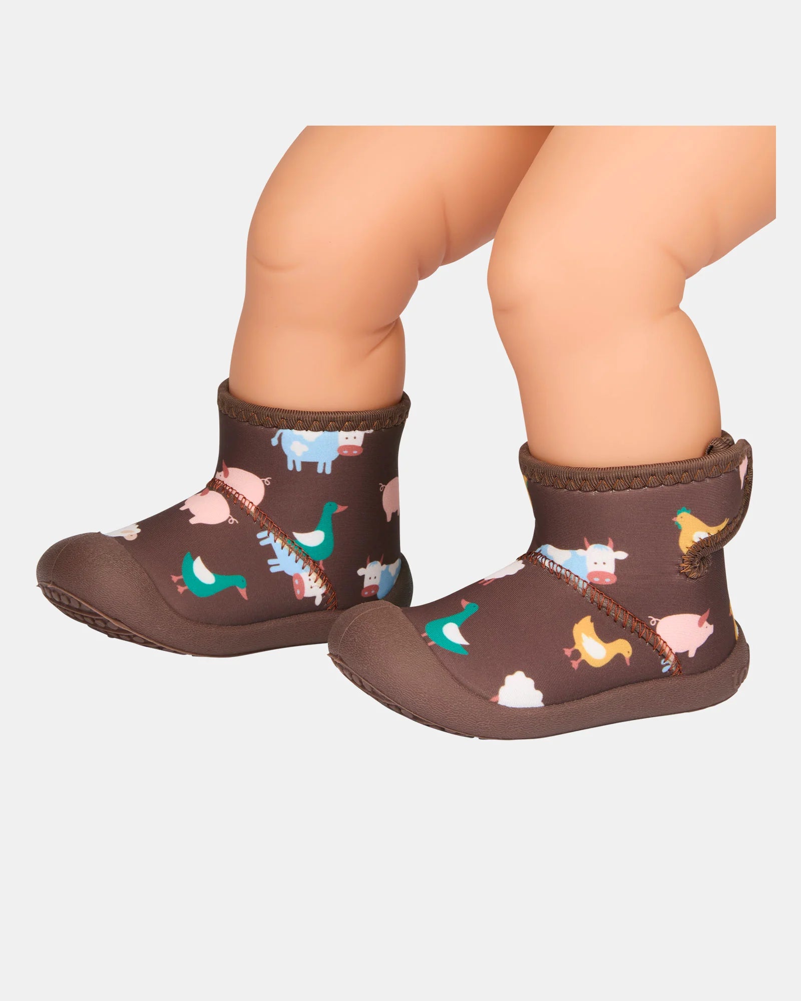 Toshi Gumbooties Neoprene Mystical Farm Buddies keep babies, toddlers, and little kids comfy outdoors with UPF 50+ UV protection in neoprene. A water-repellent inner layer helps keep the fleecy lining dry and cosy while guarding against cold, wet, rough surfaces.
