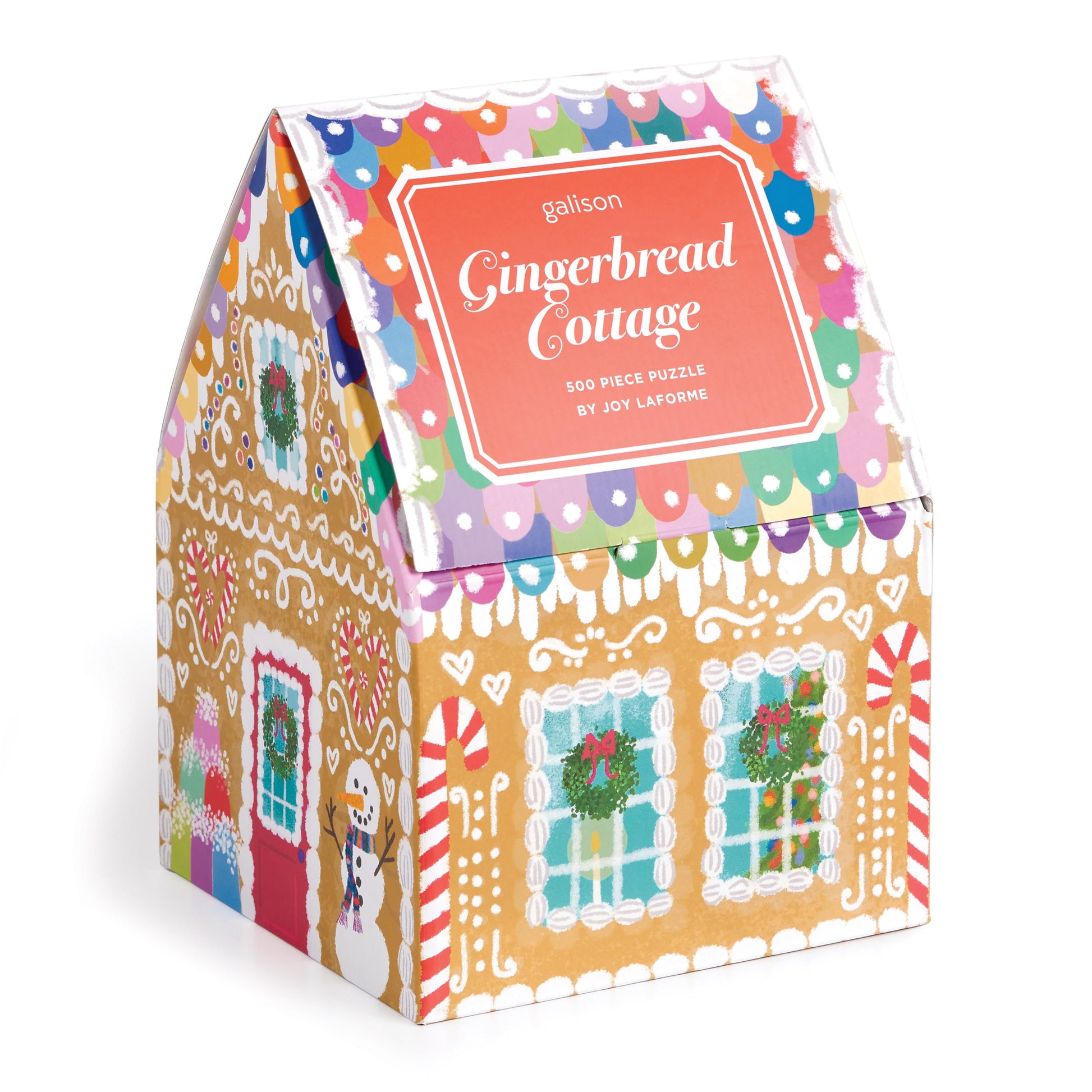 Joy Laforme Gingerbread Cottage 500 Piece House Puzzle by Galison features a cozy Christmas bakery packaged in a merry gingerbread house-shaped box.