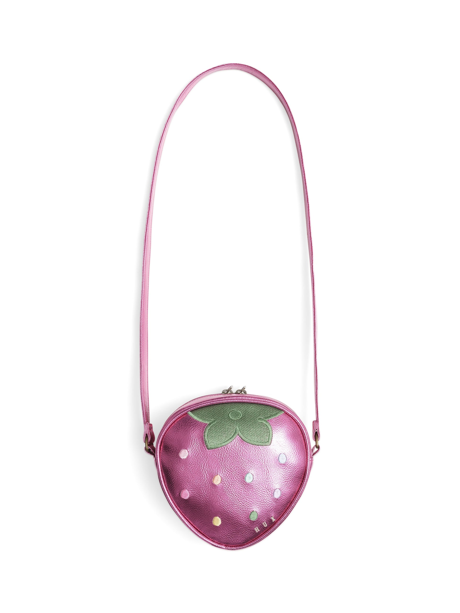 THE best handbag to stash snacks, pebbles or any other playground treasures. Features a retro strawberry cross shoulder design. Includes "Hux Bux" play money inside.