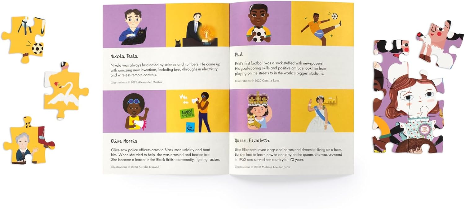 Little People, Big Dreams 100-Piece Double Sided Puzzle is a 100-piece, 2-in-1 jigsaw puzzle, featuring 30 of the worlds most famous dreamers.
