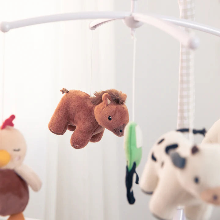 Little ones are going to love watching these adorable farm animals gently rotate overhead to the soothing tune of Brahms’ Lullaby as they drift off to sleep. With exquisite detailing, this beautiful musical cot mobile adds the perfect finishing touch to your nursery.