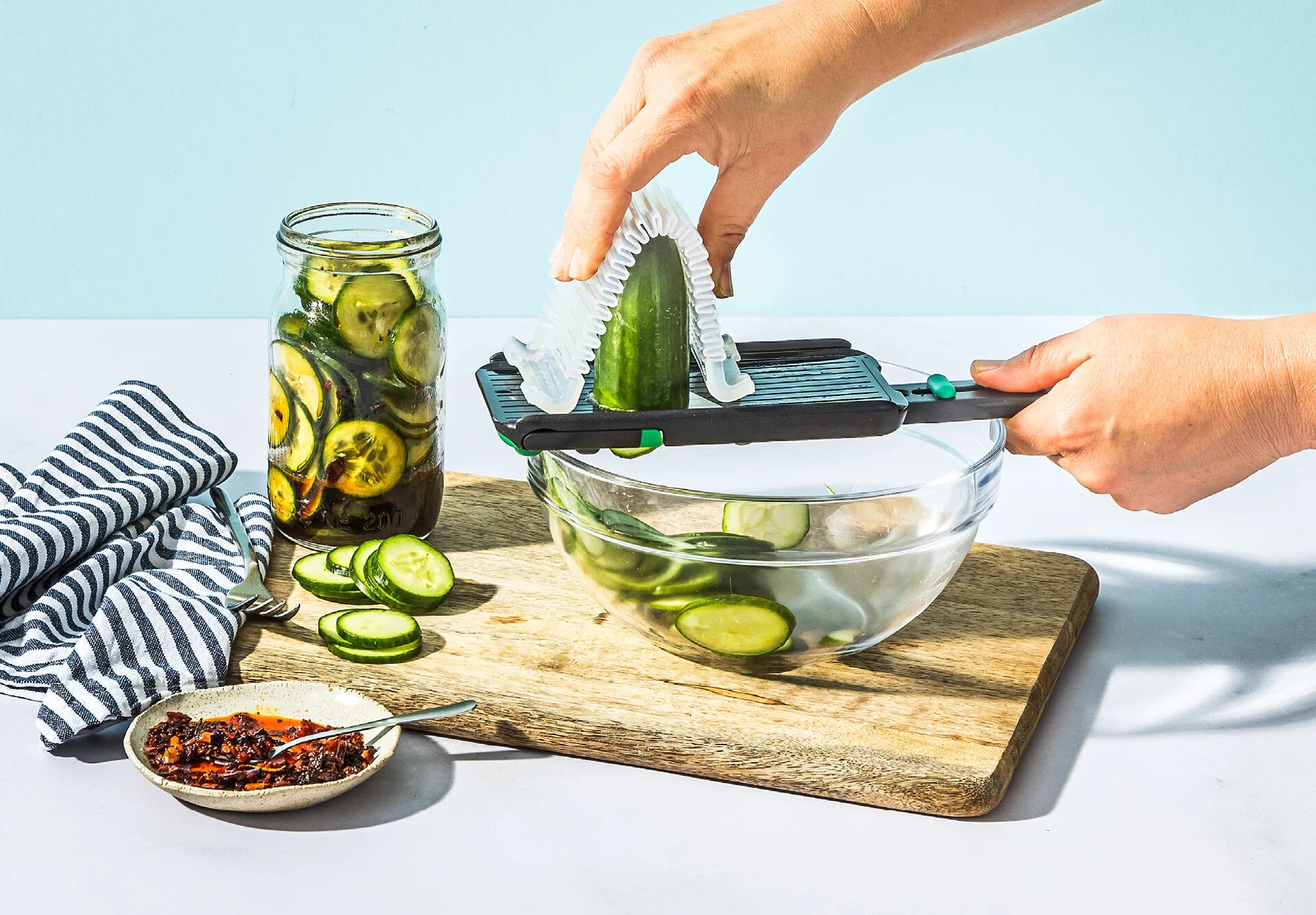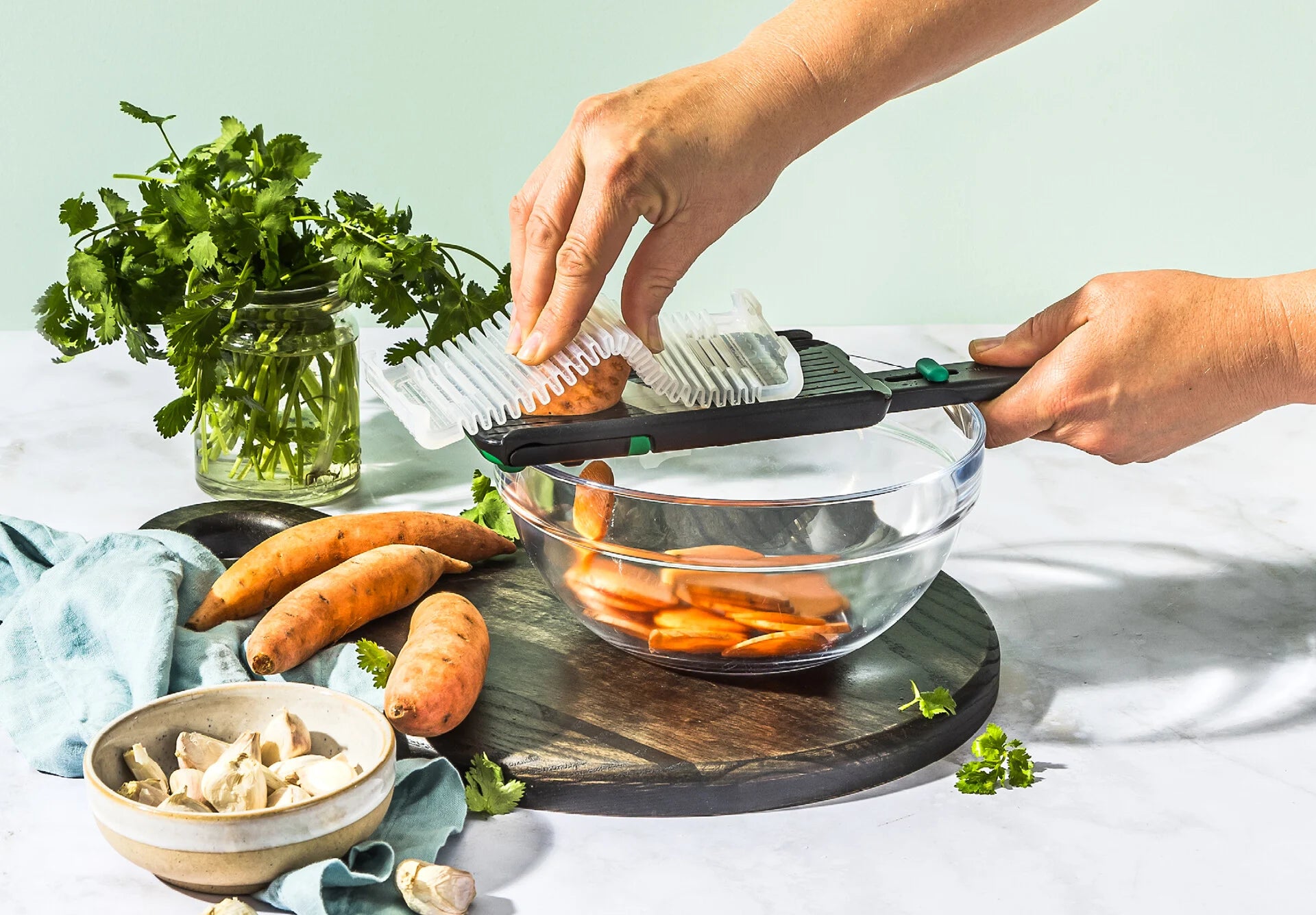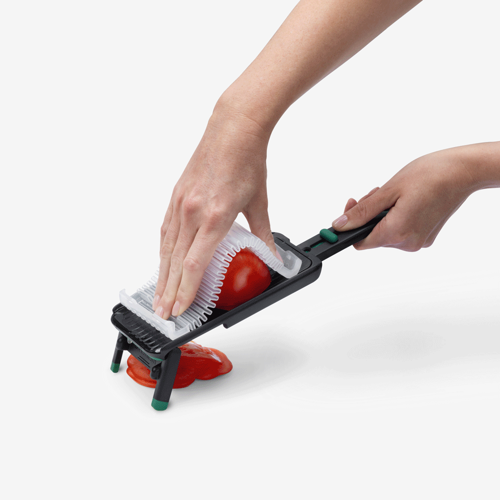 Nocutu is a mandoline with a flexible finger guard that runs on tracks to safely cut right down to the last slice.