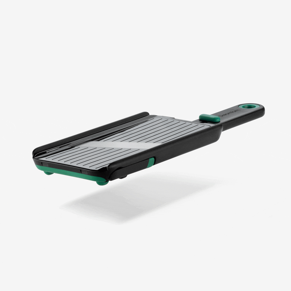 Razor-sharp Japanese stainless steel blade slices 1mm, 2mm, and 3mm thicknesses, and locks closed for safe storage.