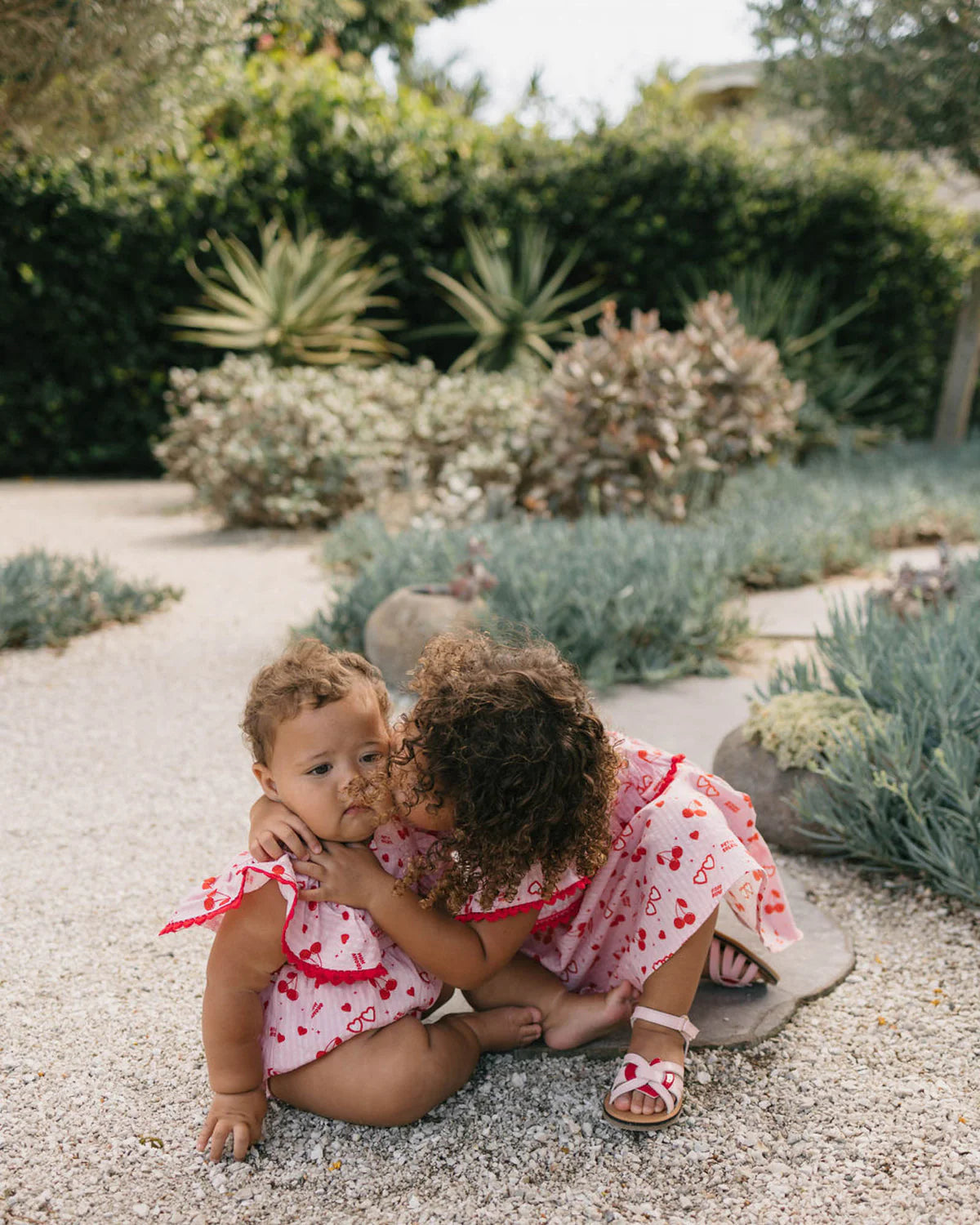 The Rae Sandal in Pink features a soft faux leather finish with a bold heart detail and easy velcro straps for a secure, adjustable fit. Perfect for busy days, big adventures, and little moments of fun.