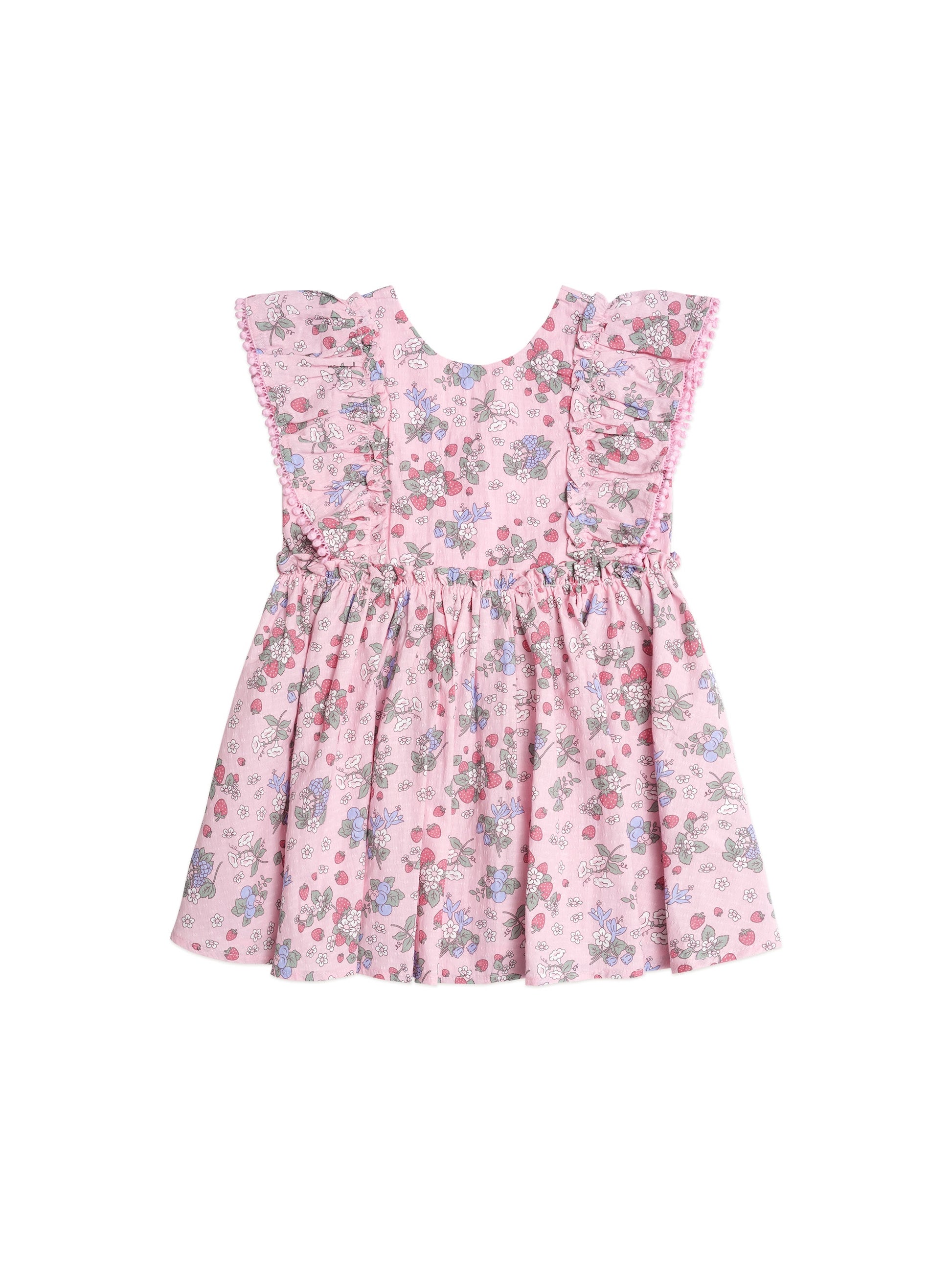 Spring has arrived in the prettiest strawberry garden Sunday best dress. Made from 100% organic cotton, it features shoulder ruffles, fabric buttons, and an oversized bow at the back.