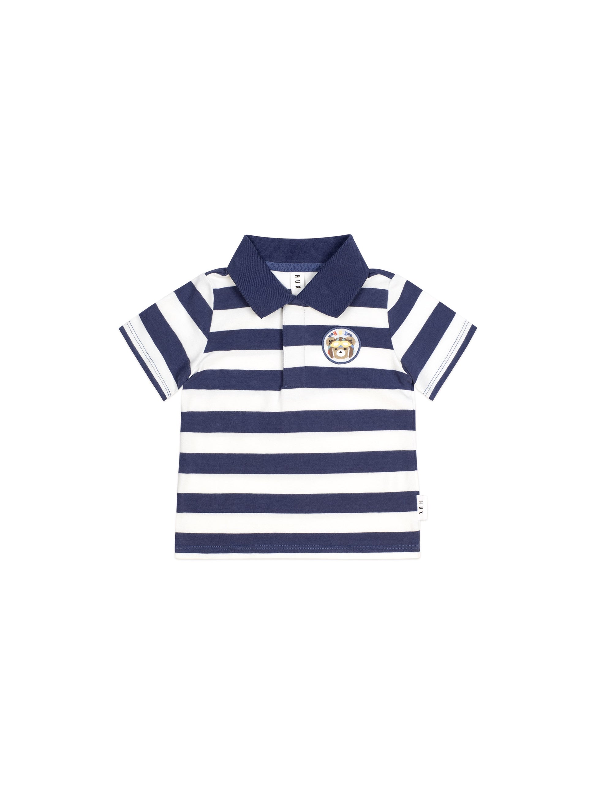 This short-sleeved polo in classic navy stripes features a sporty, rugby-style collar and three buttons at the neck. Made from cloud-like organic cotton, it has a pilot Huxbear badge detail and can be dressed up or down, depending on the day.