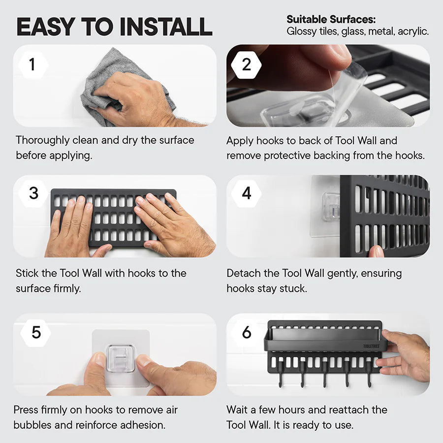 The Tool Wall is more than just a shower caddy. It’s a full-blown grooming station built for busy lives. With five sturdy hooks and a sleek, low-profile design, it holds up to 5kg of your essentials. From Scrubbers to razors, & washes to Shearers everything stays put, dries fast, and stays organized. This is the gear that finally earns a permanent spot in your shower.