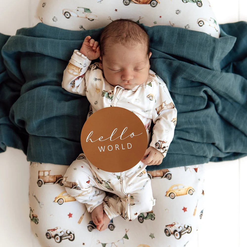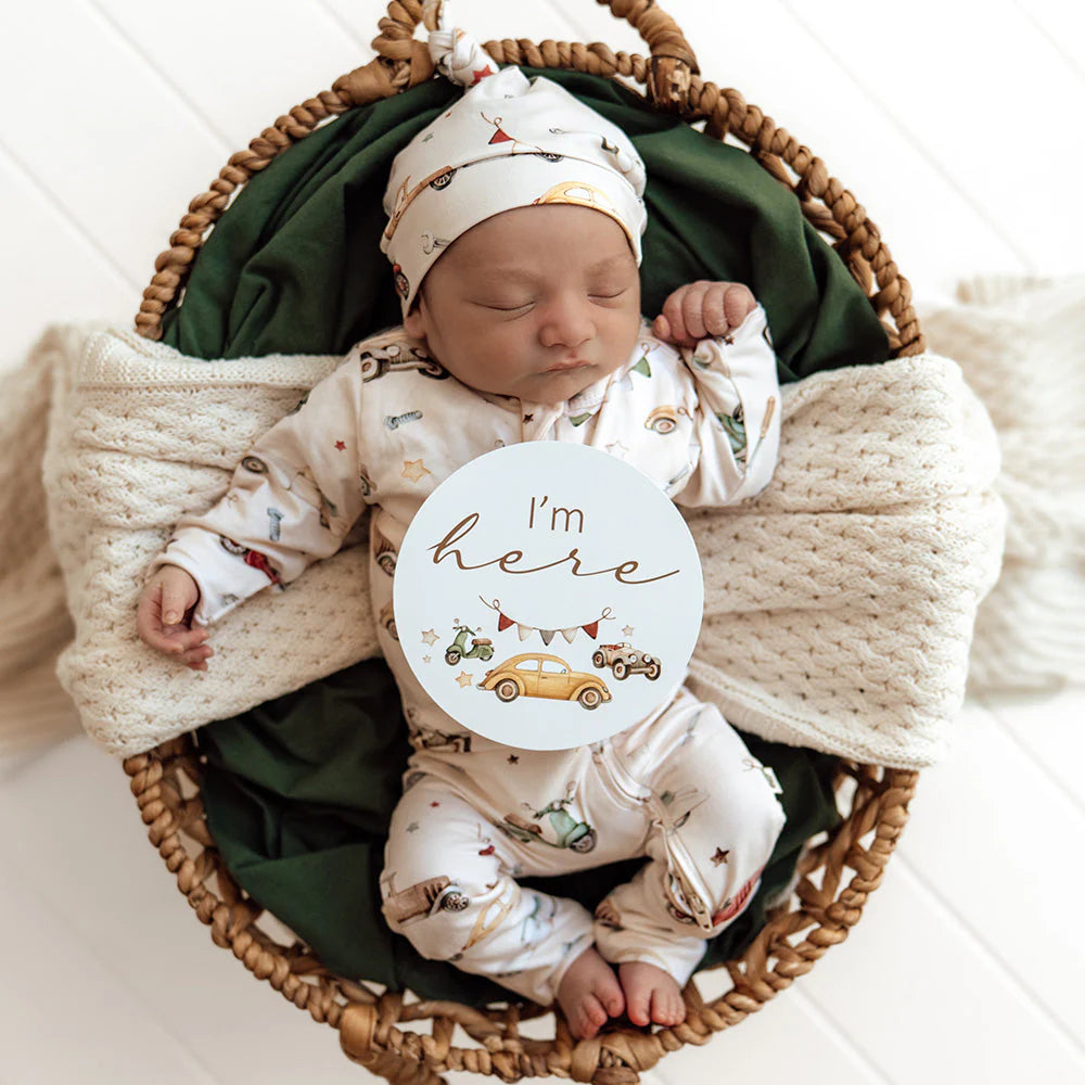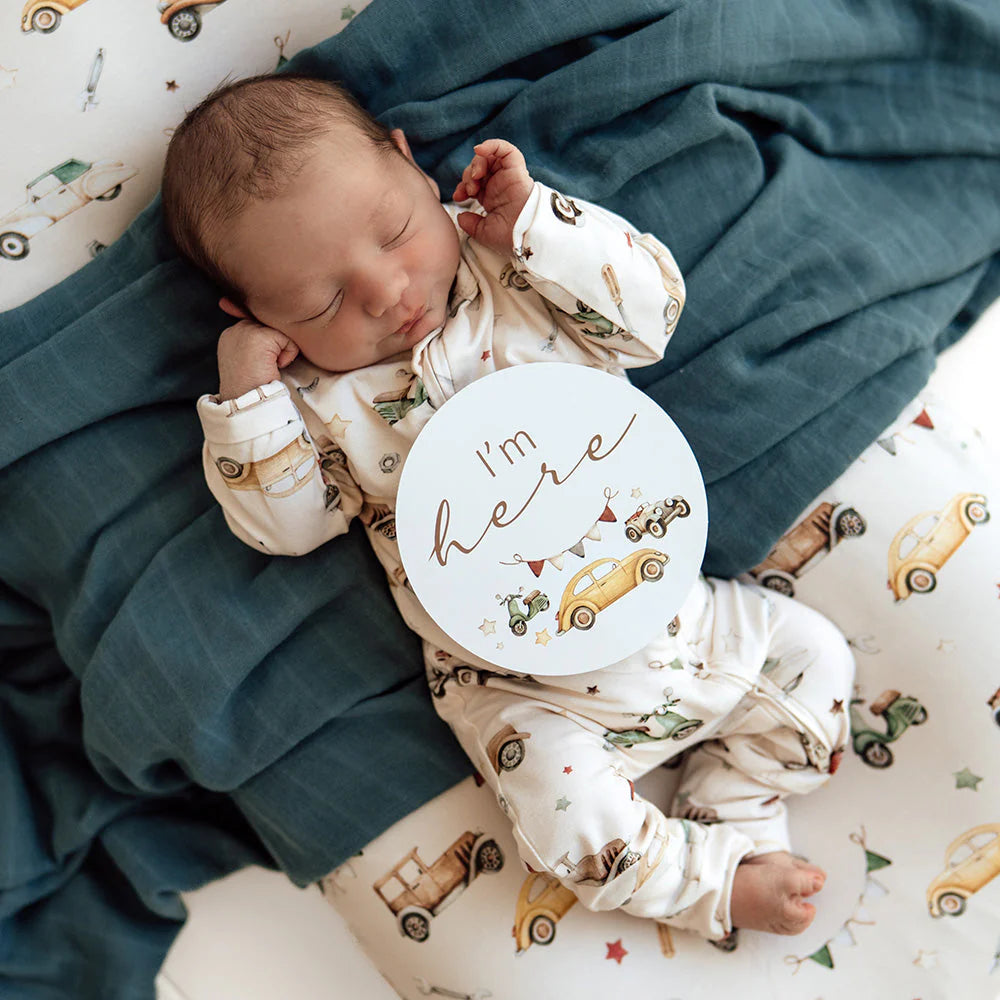 This pack contains 25 Reversible milestone cards that coordinate with our Vintage Cars organic wraps and clothing.